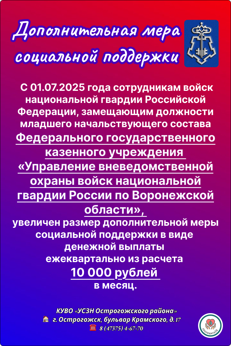 С 01.07.2025 года сотрудникам войск национальной гвардии Российской Федерации, замещающим должности младшего начальствующего состава Федерального государственного казенного учреждения «Управление вневедомственной охраны войск национальной гвардии России по Воронежской области», увеличен размер дополнительной меры социальной поддержки в виде денежной выплаты ежеквартально из расчета 10000 рублей в месяц.