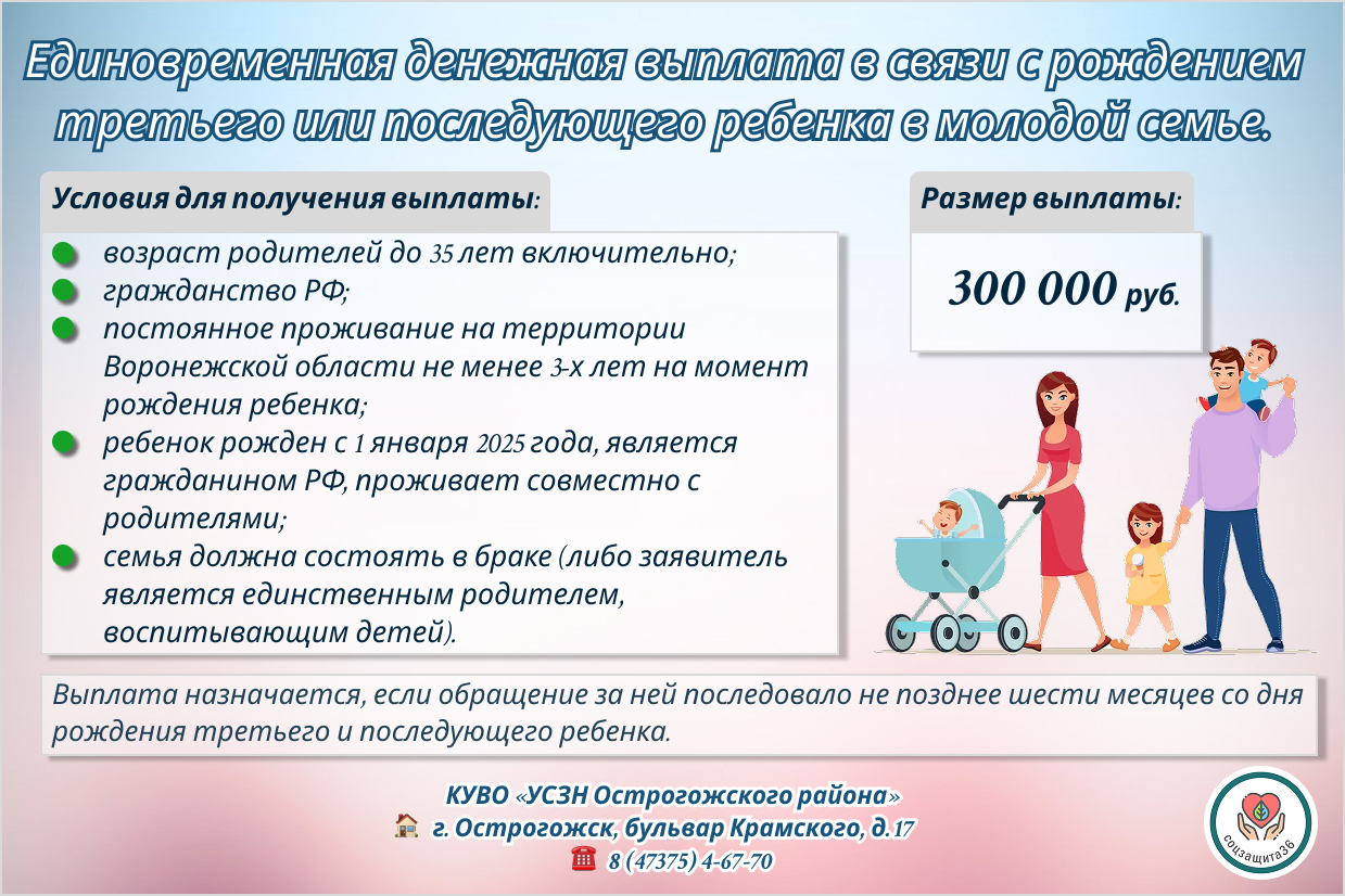 Единовременная денежная выплата в связи с рождением третьего или последующего ребенка в молодой семье.