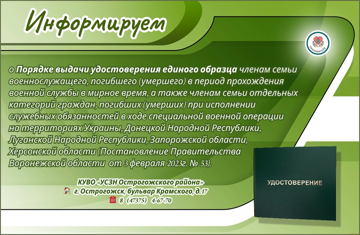 Информируем о Порядке выдачи удостоверения единого образца членам семьи военнослужащего, погибшего (умершего) в период прохождения военной службы в мирное время, а также членам семьи отдельных категорий граждан, погибших (умерших) при исполнении служебных обязанностей в ходе специальной военной операции на территориях Украины, Донецкой Народной Республики, Луганской Народной Республики, Запорожской области, Херсонской области (Постановление Правительства Воронежской области от 3 февраля 2023г. № 53).
