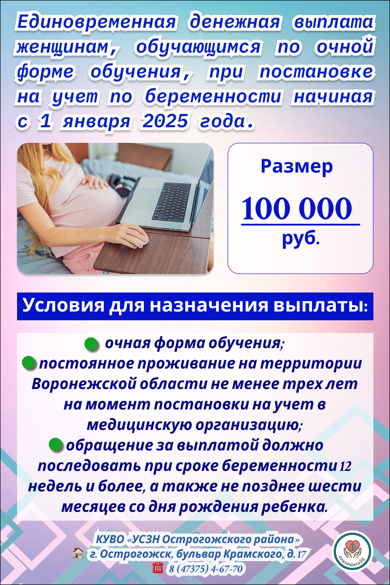 Женщины – студентки при постановке на учет в медицинские организации Воронежской области в связи с беременностью, начиная с 1 января 2025 года, смогут получить единовременную денежную выплату в размере 100 тысяч рублей.