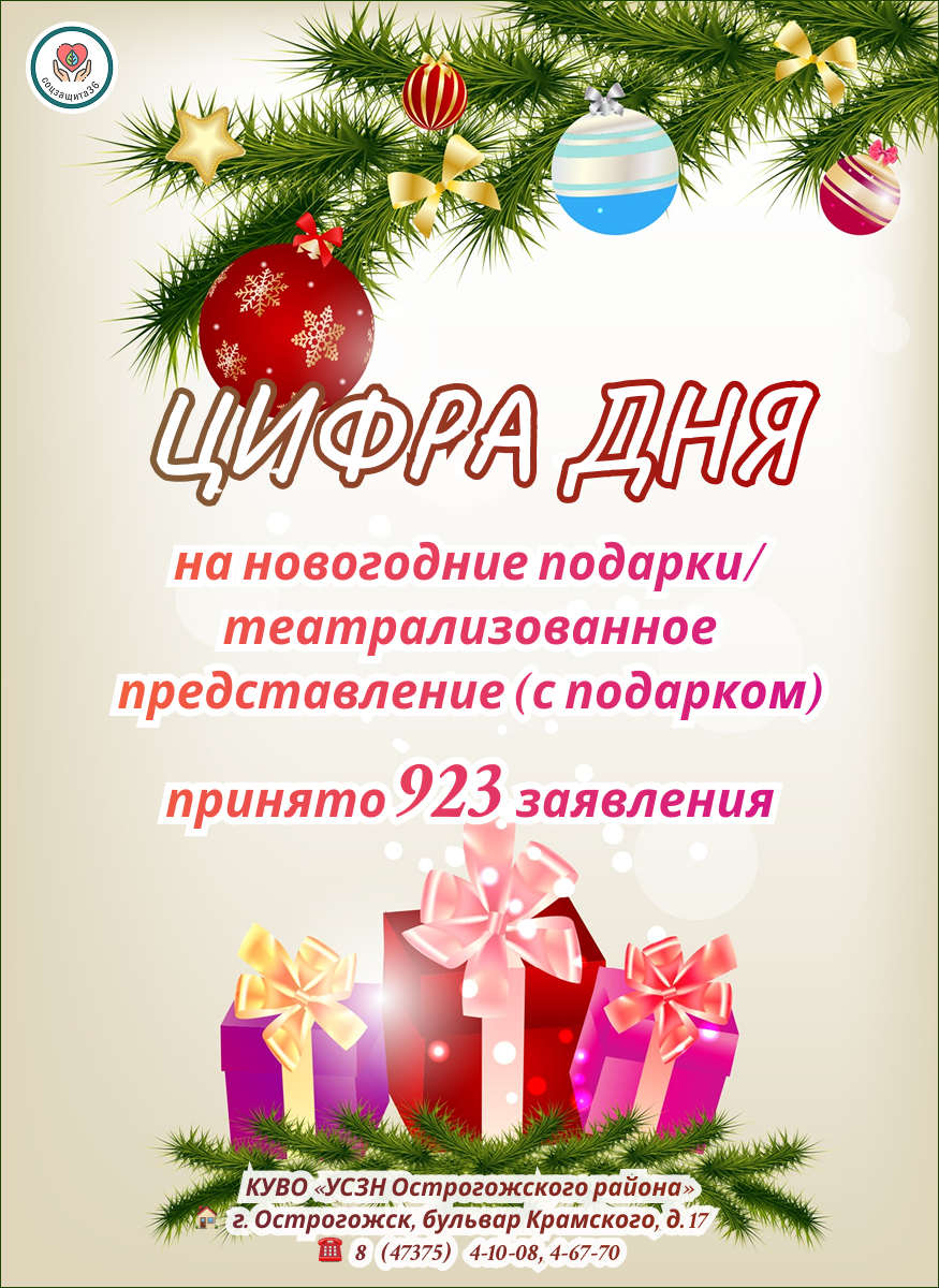 Для предоставления новогодних подарков в виде наборов кондитерских изделий в ассортименте и пригласительных билетов на театрализованные представления (с подарком) детям льготных категорий Вам необходимо обратиться в КУВО «УСЗН Острогожского района».
